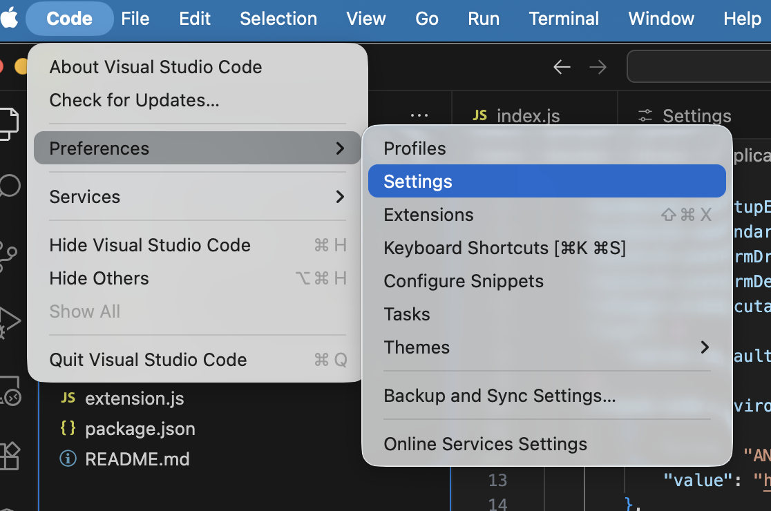 "claude-code.environmentVariables": [ { "name": "ANTHROPIC_BASE_URL", "value": "https://api.xaicontrol.com" } ]- 打开 VS Code 设置 (快捷键