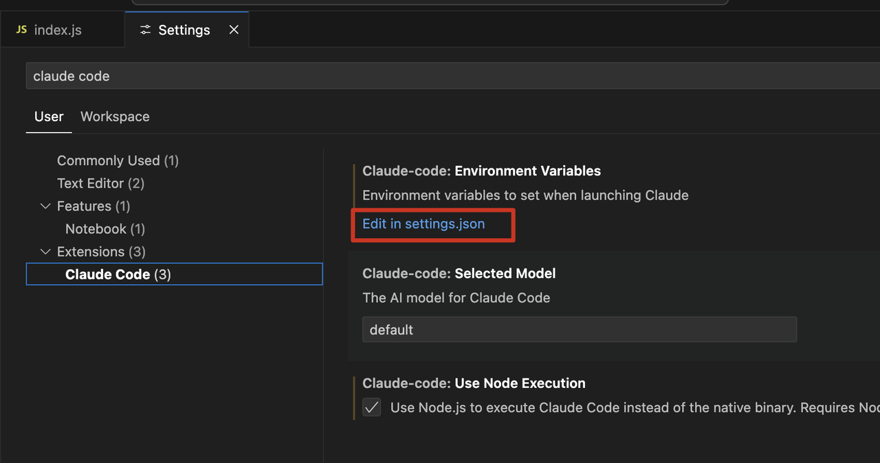 claude-code.environmentVariables。 - 在找到的设置项下,点击 “Edit in settings.json”。